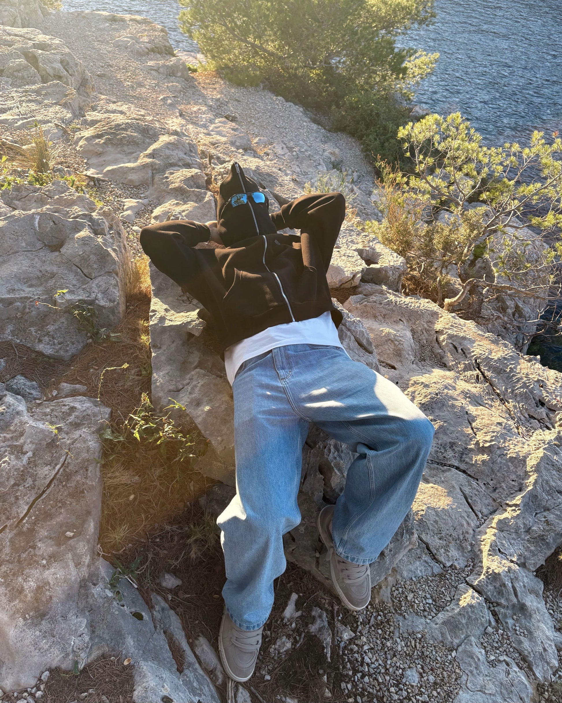 - Coupe loose avec épaules tombantes et cordons réglables à la capuche