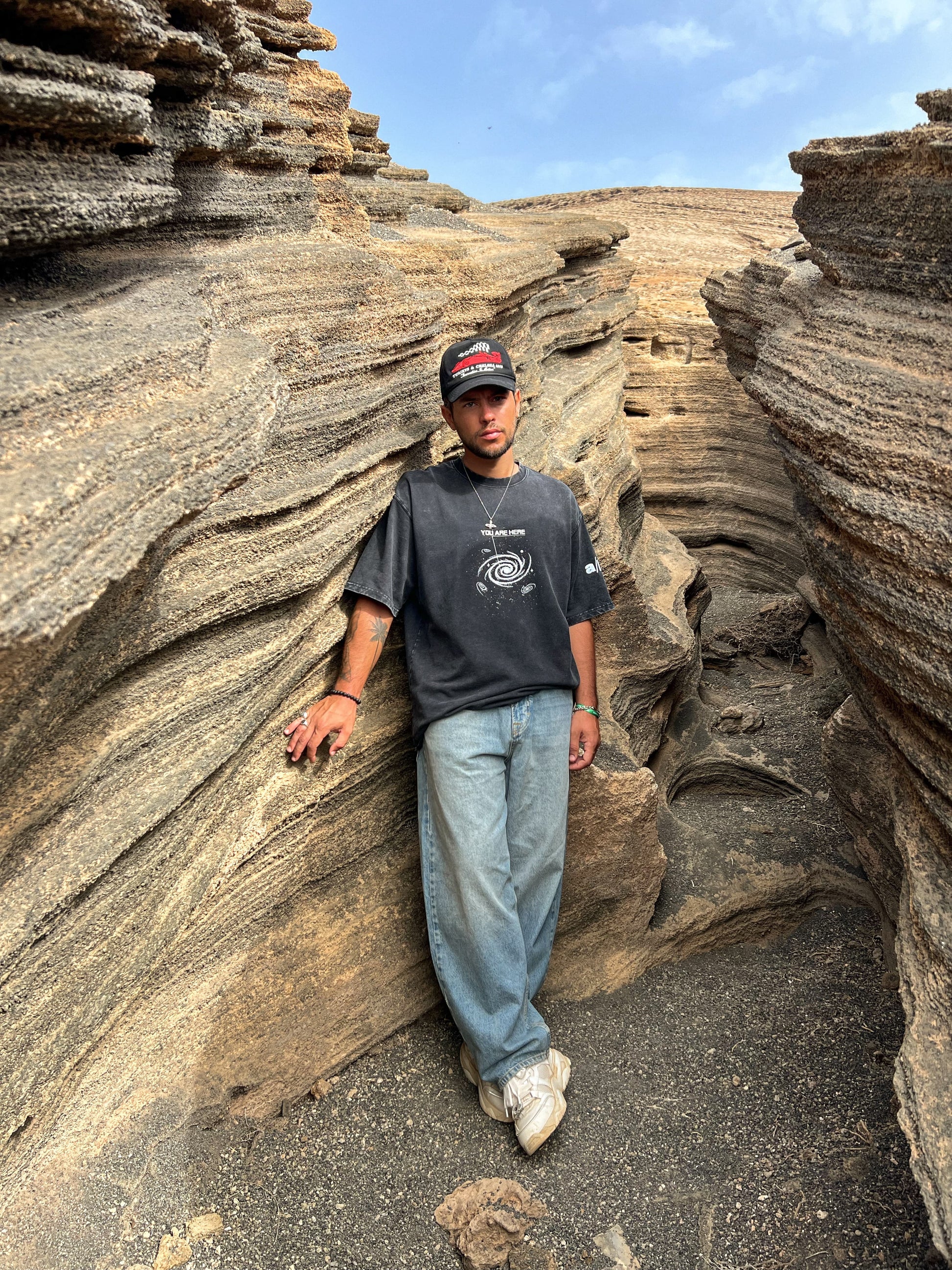 - Vintage oversized cut with raw-edge hems and washed finish